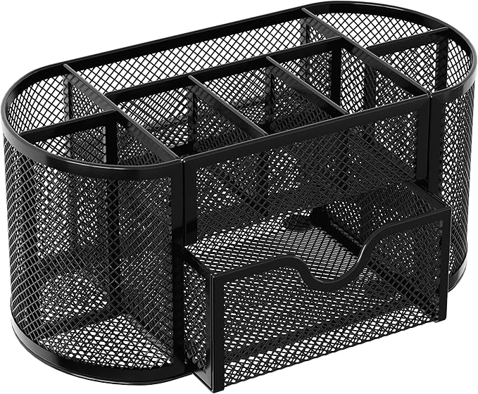 EasyPAG Mesh Pen Holder Desk Organizer with Drawer Stationery Supplies Organizer for Dorm School 9 Compartments Workspace Desk Accessories Organization for Office, Black