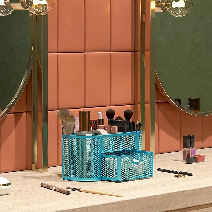 EasyPAG Mesh Pen Holder Desk Organizer with Drawer Stationery Supplies Organizer for Dorm School 9 Compartments Workspace Desk Accessories Organization for Office, Blue