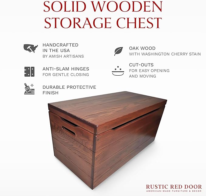 Amish Made Wooden Storage Chest Trunk Box with Lid and Handles for Bedroolanket, Clothes, Anti-Slam Hinges, Handmade, Rustic, Oak Wood, Cherry Stain, 30"