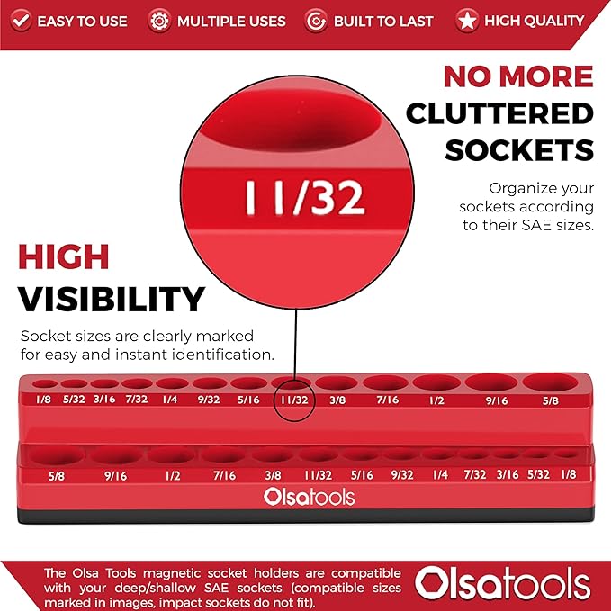 - ★ HIGH CAPACITY - This Olsa Tools Magnetic Socket Organizer (for SAE sockets) can store up to 26 of your 1/4-drive SAE sockets. Give yourself the neatness and organization you deserve.