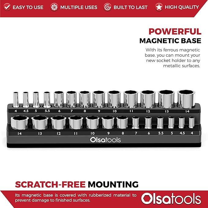 - ★ HIGH CAPACITY - This Olsa Tools Magnetic Socket Organizer (for Metric sockets) can store up to 26 of your 1/4-drive Metric sockets. Give yourself the neatness and organization you deserve.