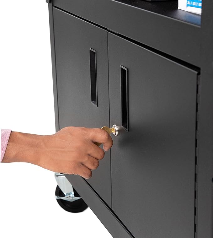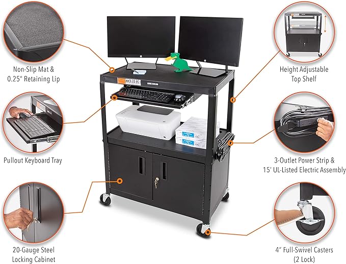 Line Leader Extra Wide AV Cart with Locking Cabinet, Rolling Computer Desk, Height Adjustable Utility Cart with Pullout Keyboard Tray & UL-Listed Power Strip, Great for Projectors (42 x 32 x 20in)