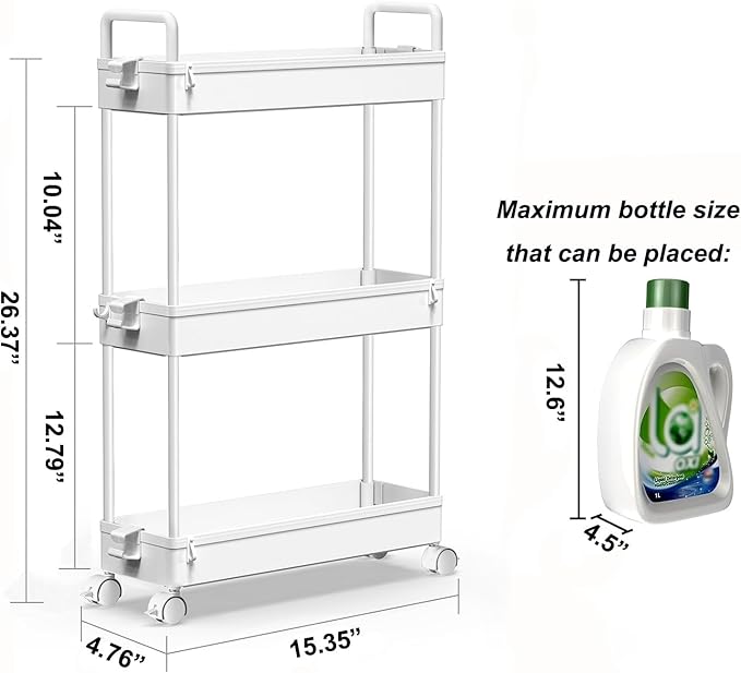 - 【Slim Design – Fits 4.76" Gaps】 : With only 4.76 inches in depth, this 3 tier slim rolling storage cart slides effortlessly into tight spaces like gaps between your washer and dryer, bathroom laundry room corners, under kitchen counters, next to fridge, or narrow hallways. Maximize every inch of your home while keeping it neat and organized