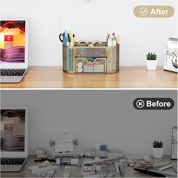 - Premium Material: This desk pen holder made of iron material, it ensures the desktop organizer with drawers sturdiness and durability, scratch- and chip-resistant powder-coated finish, allowing for long-term use.