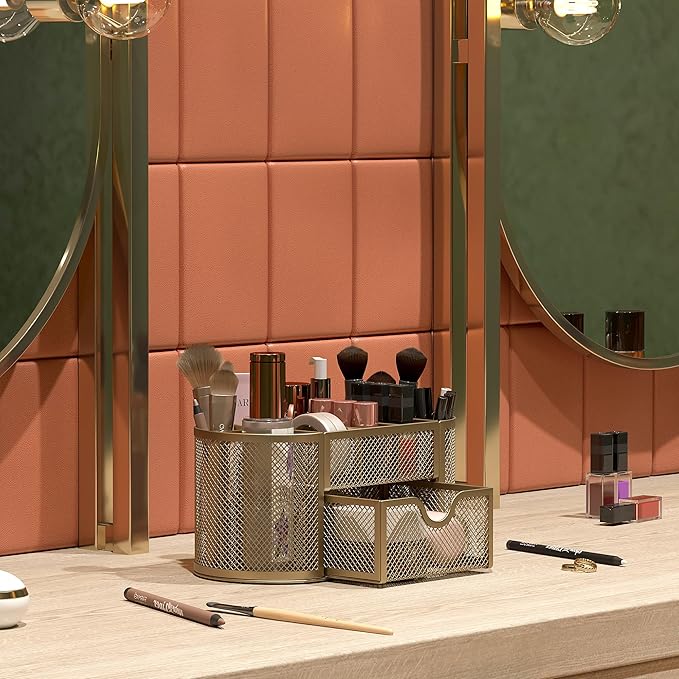 EasyPAG Mesh Pen Holder Desk Organizer with Drawer Stationery Supplies Organizer for Dorm School 9 Compartments Workspace Desk Accessories Organization for Office, Gold