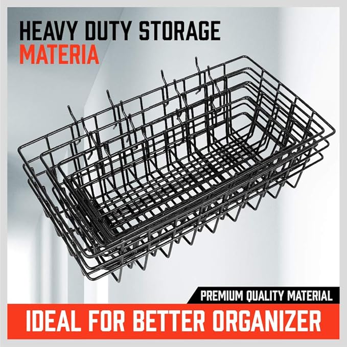 - Product includes 4 different size pegboard Baskets , S (6 x 3 x 2 inch) , M (8 x 4 x 3.5 inch) , L (12 x 6 x 3.5 inch) , XL (13 x 7 x 4 inch), each pin board basket can hold 30lbs.