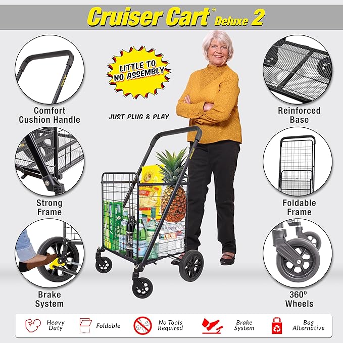 dbest products Cruiser Cart Deluxe 2 Shopping Grocery Rolling Folding Laundry Basket on Wheels Foldable Utility Trolley Compact Lightweight Collapsible, Black