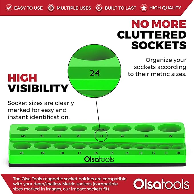 - ★ HIGH CAPACITY - This Olsa Tools Magnetic Socket Organizer (for Metric sockets) can store up to 19 of your 1/2-drive Metric sockets. Give yourself the neatness and organization you deserve.