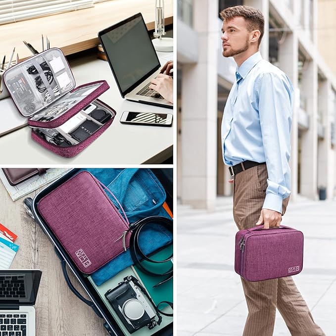 • 【DOUBLE LAYERS TECH ORGANIZER】- The cord organizer case is designed with 2 layers. The first layer to organize small electronic accessories like cords, cables, USB, chargers, earphones. The second layer to organize larger electronics accessories like tablet, power bank, adapters, hard drive, cellphone, mouse.