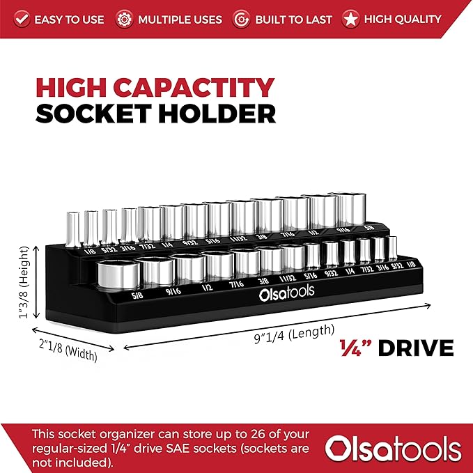 - ★ HIGH CAPACITY - This Olsa Tools Magnetic Socket Organizer (for SAE sockets) can store up to 26 of your 1/4-drive SAE sockets. Give yourself the neatness and organization you deserve.