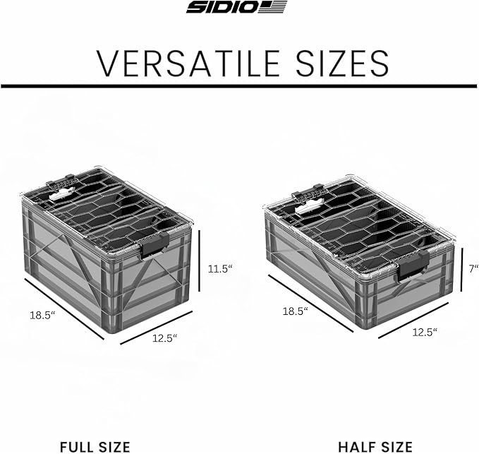 - WHAT'S INCLUDED: The SIDIO Starter Pack includes two full sized crates, one half sized crate, 3 lids and 3 standard divders. Full size exterior measures 18.5”x12.5”x 11” without Lid; 11.5" with Lid, while the half size exterior measures 18.5”x1 2.5”x 6.5” without Lid; 7" with Lid.