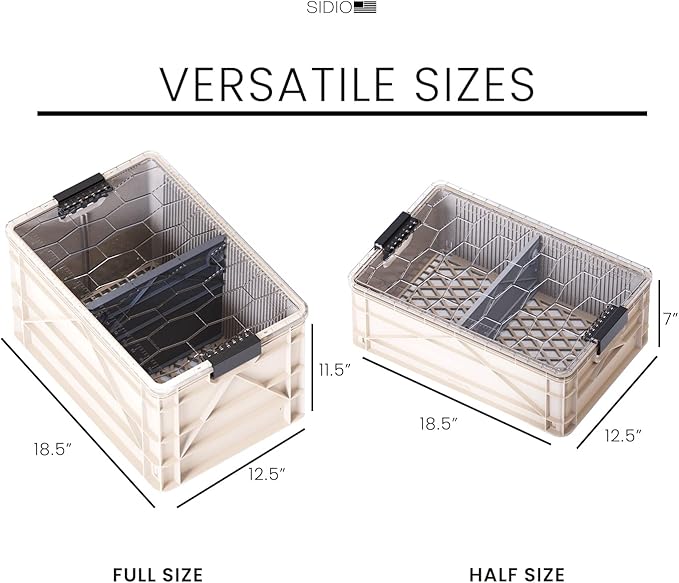 - WHAT'S INCLUDED: The SIDIO Starter Pack includes two full sized crates, one half sized crate, 3 lids and 3 standard divders. Full size exterior measures 18.5”x12.5”x 11” without Lid; 11.5" with Lid, while the half size exterior measures 18.5”x1 2.5”x 6.5” without Lid; 7" with Lid.