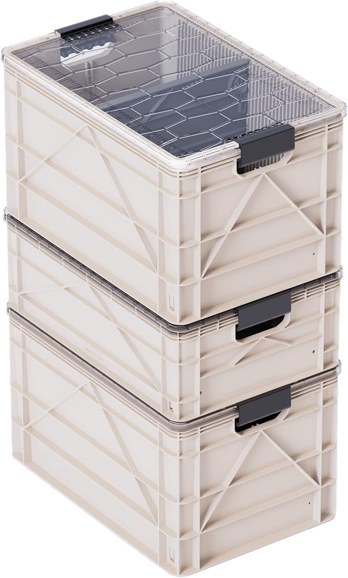 SIDIO CRATE Starter Pack - Two Full Size and One Half Size SidioCrate, Stackable Outdoor Organizer Storage Bins with Clear Lid and Dividers - Tan
