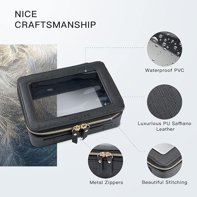 - ❤【LUXURY DESIGN】Measuring 7.9” x 5.7” x 2.7”(20 cm x14.5cm x 7cm), our makeup bag is leek and stylish, this makeup travel organizer was designed in a minimalist boxy shape and a cool black color. Crafted in beautiful PU leather and finished with polished hardware, it's the clear pouch you'd be happy with sitting out on display beside you.