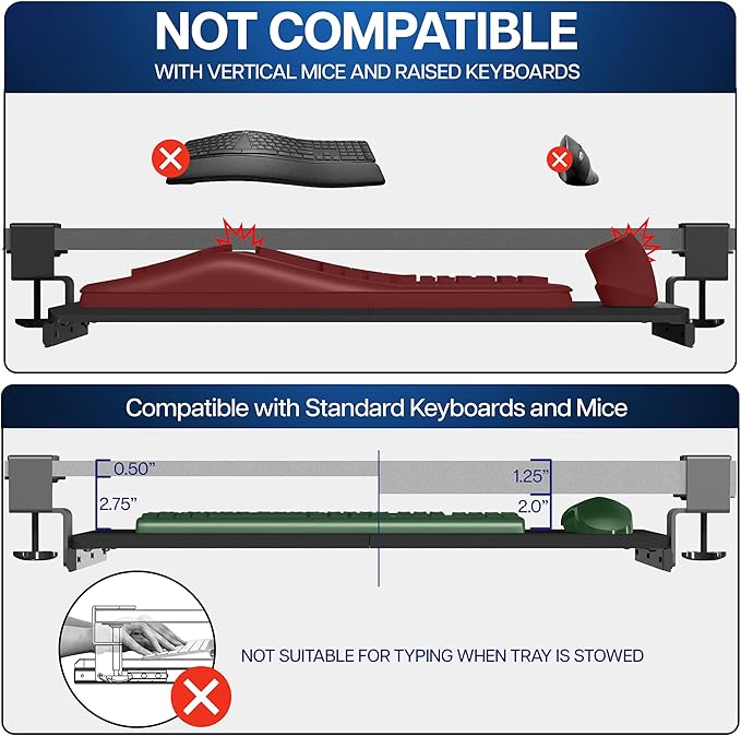 - Easy Installation: All hardware and instructions are provided for assembly, and mounting your keyboard tray to the desk is an easy process with the adjustable clamps. Please Note: This tray is not compatible with desktops that have beveled edges