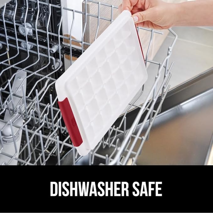 GORILLA GRIP BPA-Free Easy Release Ice Cube Tray for Freezer, Make Lots of Ice, 56 Cubes Total, Kit Includes 2 Stackable Leakproof Trays with Lid and Soft Handle Grips, Scooper, Bin, For Coffee, Red