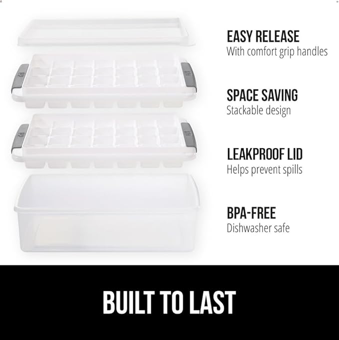 GORILLA GRIP BPA-Free Easy Release Ice Cube Tray for Freezer, Make Lots of Ice, 56 Cubes Total, Kit Includes 2 Stackable Leakproof Trays with Lid and Soft Handle Grips, Scooper, Bin, For Coffee, Gray