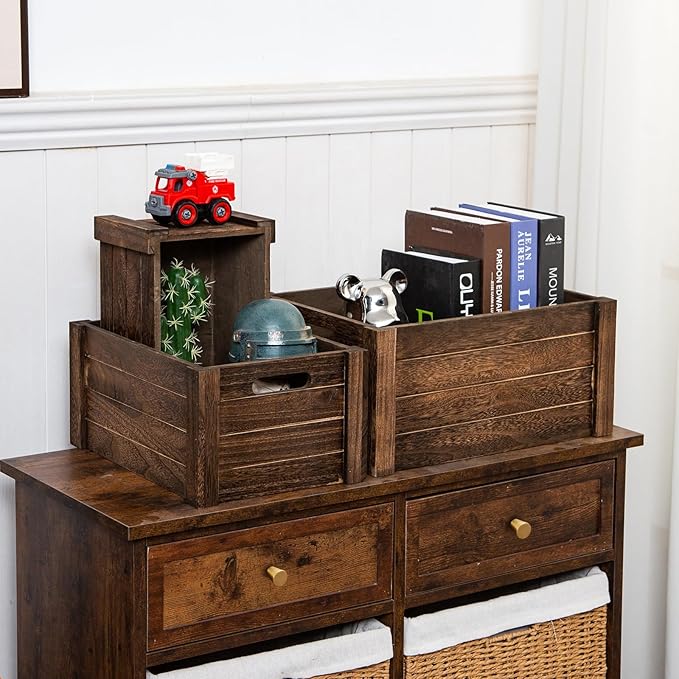 - 【Multi Functional Use】--Our Wooden Boxes Can Store Most Of The Daily Necessities, Such As Books, Toys, Clothes, Discs, Milk, Wine, Etc. It Can Also Serve As A Display Platform. The Suitable Scene Space For Boxes Are Also Quite Diverse, Which Can Be Placed In The Living Room, Studyroom, Bedroom, Office, Shopping Mall Or Stores.