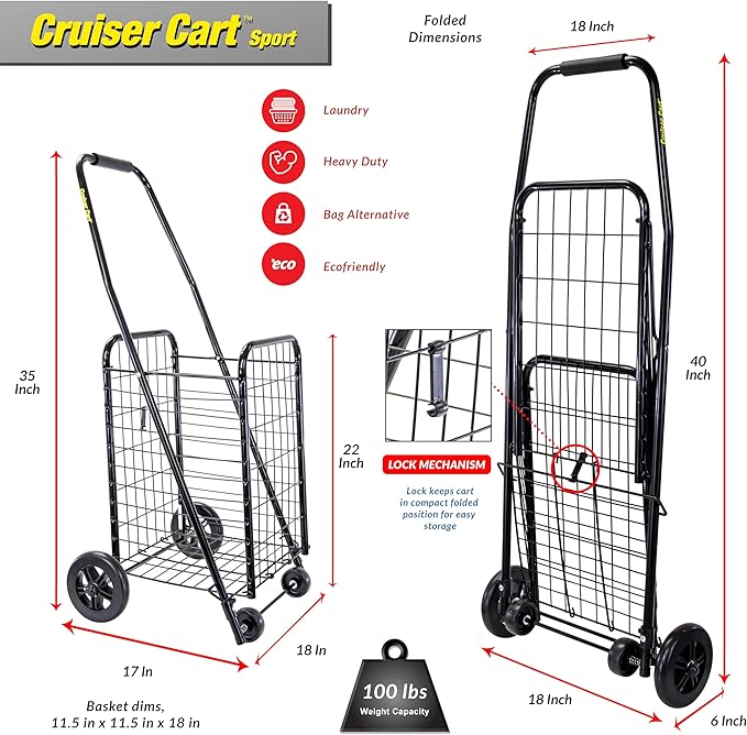 - ๐๐ผ๐บ๐ฝ๐ฎ๐ฐ๐ & ๐๐ผ๐น๐ฑ๐ฎ๐ฏ๐น๐ฒ โ This collapsible shopping cart folds flat with a lock for easy storage; dimensions: open 17"x18"x35", folded 18"x6"x40"
