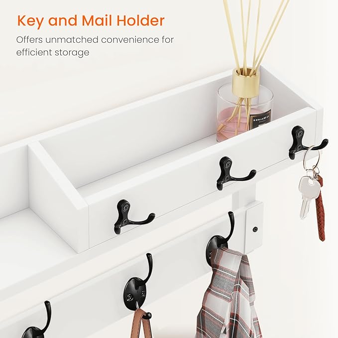 Homode Coat Rack Wall Mount with Hooks and Mail Holder, Entryway Floating Shelf with Key Hooks, Hanging Coat Hanger for Entry, Bathroom, Hallway, Bedroom, White