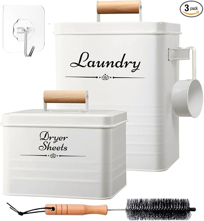 - ✅【COMPLETE LAUNDRY STORAGE SET】 Each beautifully designed Cruleen package contains (1) Powder Laundry Detergent Container (1) Dryer Sheet Container (1) Dryer Lint Remover Brush (1) Sticker Hook for Conveniently Hanging Lint Brush.