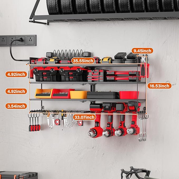 - This wall mount tools battery holder features a four-tier, large capacity design with storage space, shelf height that offers more space, 4.92 inch mid-tier tool rack for more charging posts, batteries, and added pliers holders, drill bit storage on the side. Size: 35.55*9.45*16.53 in.