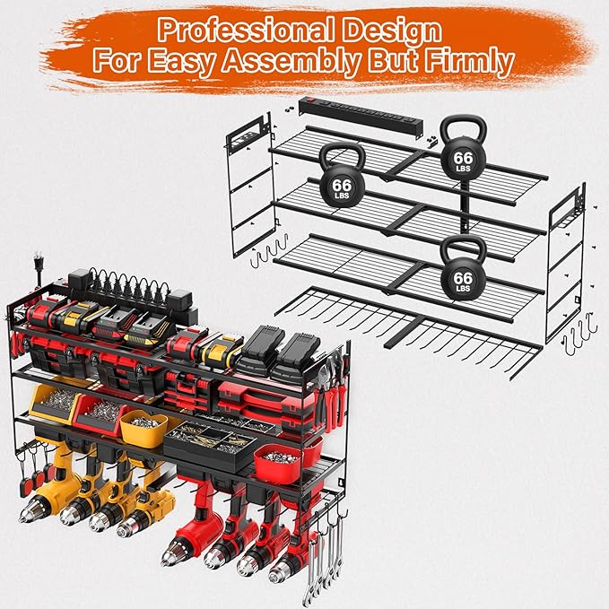 - Easy to assemble and hang, it only takes a few minutes to assemble the perfect heavy duty tool holder. The large tools holder made of reinforced and thickened high-quality iron, with strong bearing capacity and durability. Each layer of the grid can support a maximum weight of 66IB. The tools in the picture are only used to show capacity and are not included.