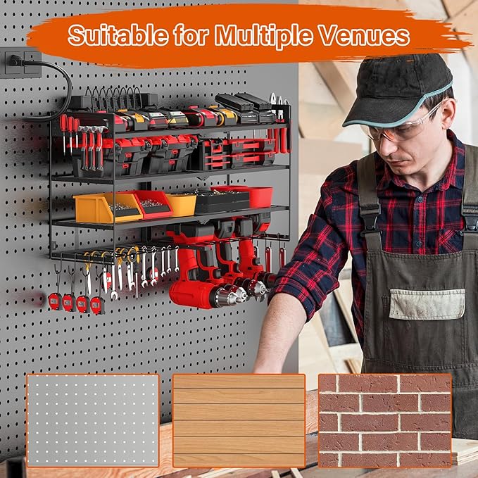- Large power tool organizer with charging in one, it is dedicated to providing an organized and efficient workspace for you. Tool organizer with 10 outlet power strip, four-tier large capacity design allow to store 8 drills on the bottom tier, batteries, chargers and other tools on the top three tiers, pliers holder are added to the side. Two side pegboard extension comes with 8 long hooks