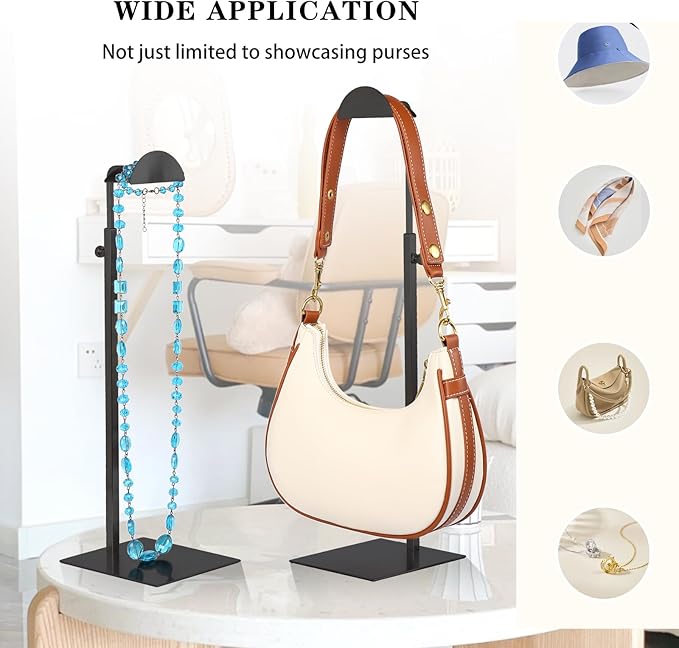 - MULTIPLE USES: In addition to being a handbag display stand, this multifunctional adjustable stand can also be used for jewelry rack, hat stand, decorative stand, headphone holder, scarf display, wreath holder and other accessories. Suitable for retail stores, boutiques, personal home display and storage.
