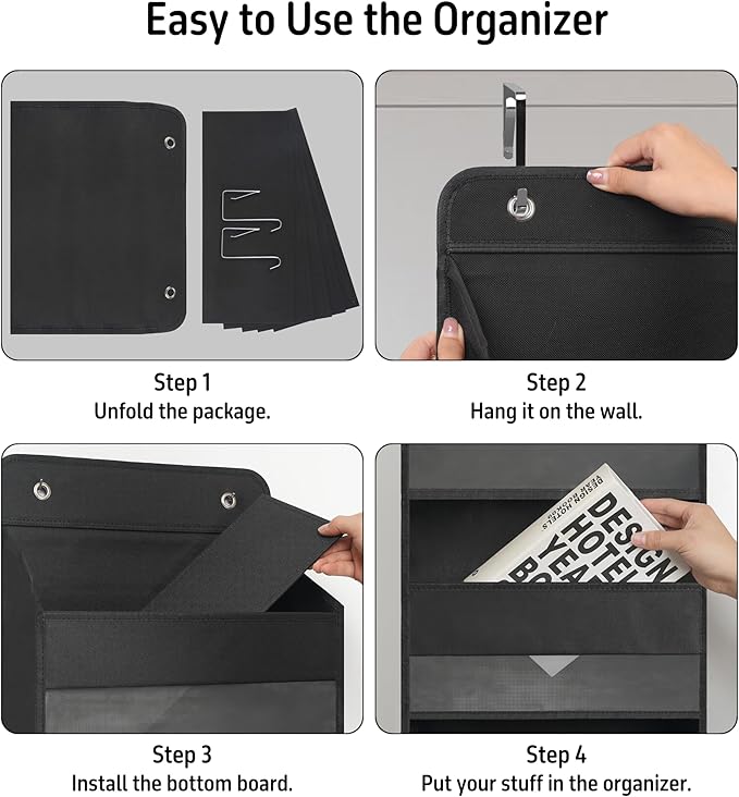 - EFFORTLESS INSTALLATION - No hardware required; simply hang the organizer using the adjustable metal hook that fits most doors, ensuring a hassle-free setup process.
