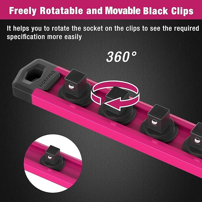 - Heavy Duty: The WORKPRO socket tray features a high-quality aluminum rack and premium nylon clip holder with a spring-loaded steel bead that securely snaps the socket onto the clips and withstands repeated use