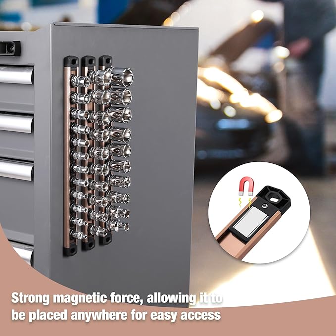 - Efficient Organization and Storage: Easy to organize sockets in your garage area. Maximize storage space and keep tool areas neatly organized so you can find any socket of any size you need. The hanging hole in the base of the socket allows for better wall storage, while it also attaches to the side of a tool cabinet, tool drawer, or any steel surface