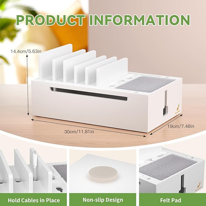 - Creative Design: Our Charging Station designed with a wide flat tray with felt pad not only aesthetic, but also can prevent your items from being scratched. Spacious 6 baffles can hold your phones, tablets or game consoles no matter how thick case on. 4 special grooves can organize your earbuds and stylus pens (Each part is designed with data cable holes for easy charging and hold cables in place)