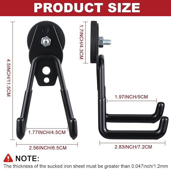 - Easy to Install: no need to use any tools, and the magnetic hooks will not break the surface; The black magnetic hooks can be placed directly on the metal surface; Please note that the thickness of the sucked iron sheet must be thicker than 0.047 inch/ 1.2 mm; Or else the magnetic hook will slide off