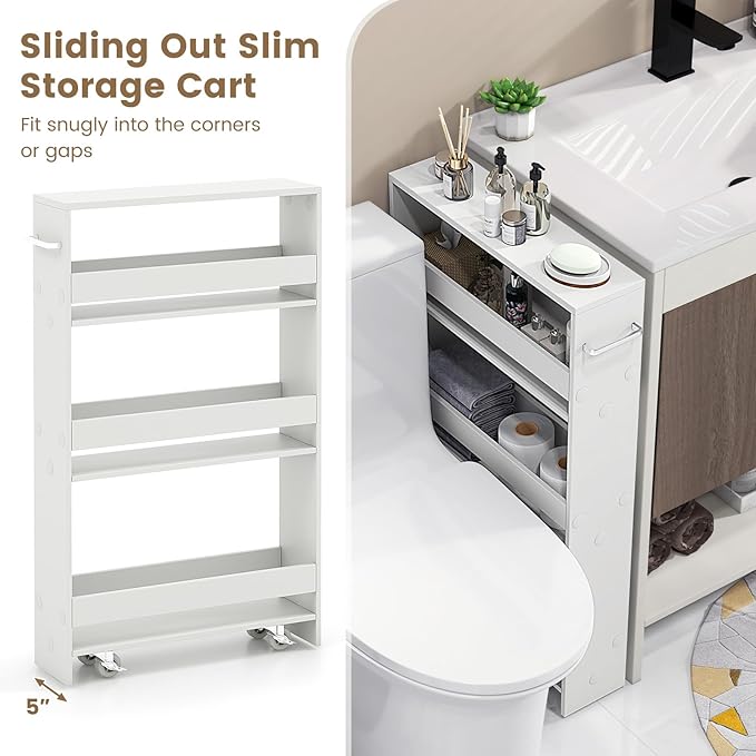 - Space Saving Design: Our slim rolling storage cart is only 5 inches wide and can fit perfectly into narrow spaces, allowing you to maximize storage potential in areas with limited space. Whether it's a narrow corner in the laundry room or beside your bed, this flexible cart can transform the tiny space into an organized storage area.