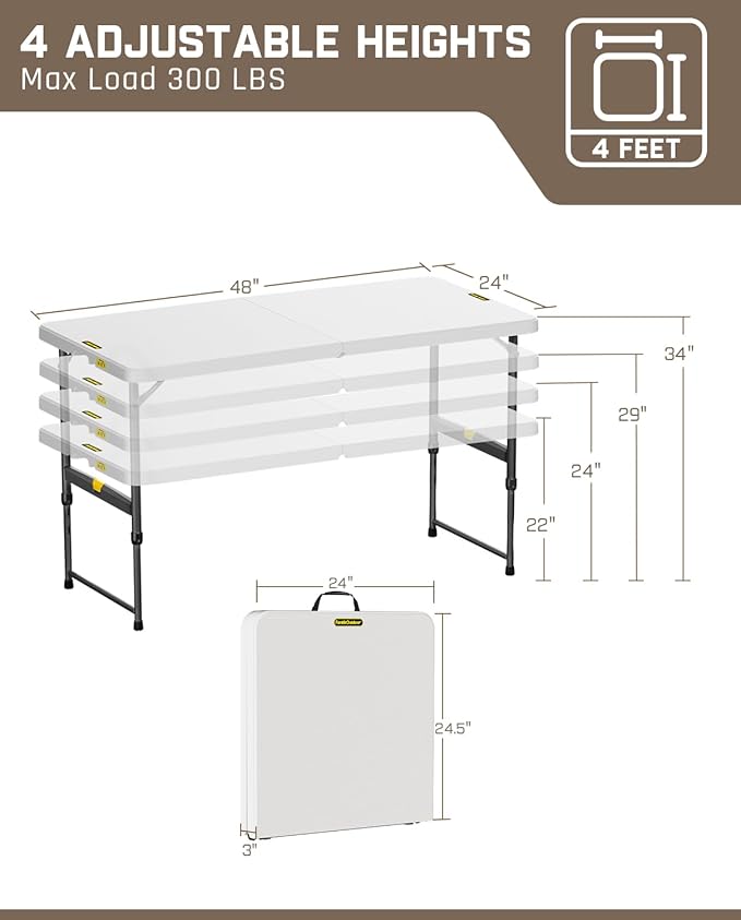 - 4 Heights Adjustable: Adjustable table with 4 flexible heights 22", 24", 29" and 34". Allows you to customize the table to your preferred level, providing comfort and productivity. Whether using it as a workstation, dining table, or display folding table, it can adapt to your needs effortlessly
