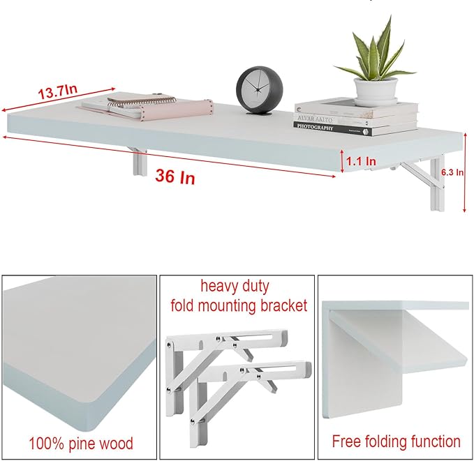 IAE Wall Mounted Folding Table with Pine Wood,36" x 14" Floating Wall Desk,Laundry Folding Table with Shelf Brackets,Fold Down Desk Shelf,Folding Workbench for Home,Dining,Laundry Room,Kitchen,White