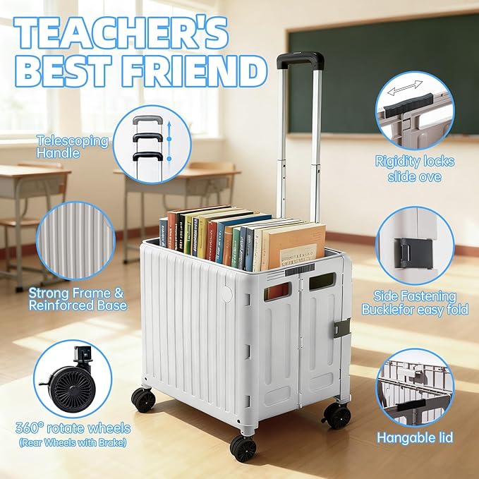 - 【Box Appearance, Aesthetic and Practical】 This durable multifunctional rolling box holds up to 110 lbs. With an extendable handle and detachable cover, it transports books, documents, office supplies, teacher essentials (lesson plans, teaching aids), groceries, laundry, or personal items—ideal as a rolling cart for teachers to organize classroom materials. Suitable for travel, shopping, moving, and daily classroom use (e.g., carrying textbooks).