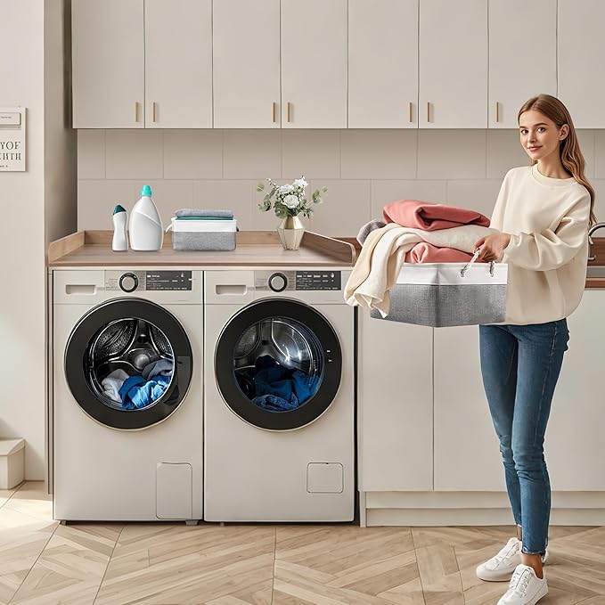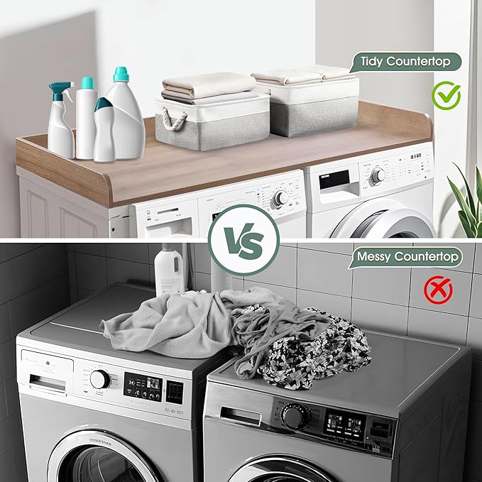 - SIZE AND COMPATIBILITY: With dimensions approximately 27.5 inches wide, 54 inches length and 3 inches depth with edge rails, this countertop is designed to seamlessly integrate with most washing machines. It provides a snug fit to protect the top surface effectively and also prevent clothing detergent etc. from falling off. Two additional storage baskets are provided for you to store dirty clothes or laundry supplies.
