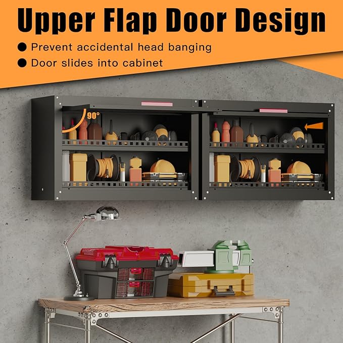 - Up Flip Door Design:Metal garage wall storage cabinet is upturned door design, not only can be upturned to 90 degrees can also be slid into the cabinet, not only to free your hands to conveniently take items, but also to prevents accidental head banging, so that the wall-mounted storage cabinets at the same time to meet the convenience and safety, very suitable for garage storage use