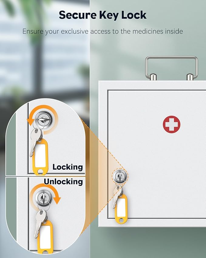 - Key-Lock Design: Come with 2 spare keys for 2 users. Simply turn the key left to lock and right to unlock the first aid cabinet. Always guarantee your private and exclusive access to the medicines inside