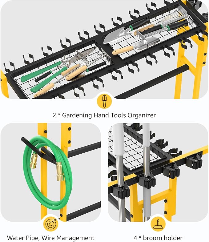 - Multi-functional floor stand tools organizer can stores 4 brooms and 20+ yard, farm, lawn tools with 2 of baskets for smaller accessories, with plumbing, wire storage. And the bottom shelf can store boxes, buckets, showerheads and other tools.