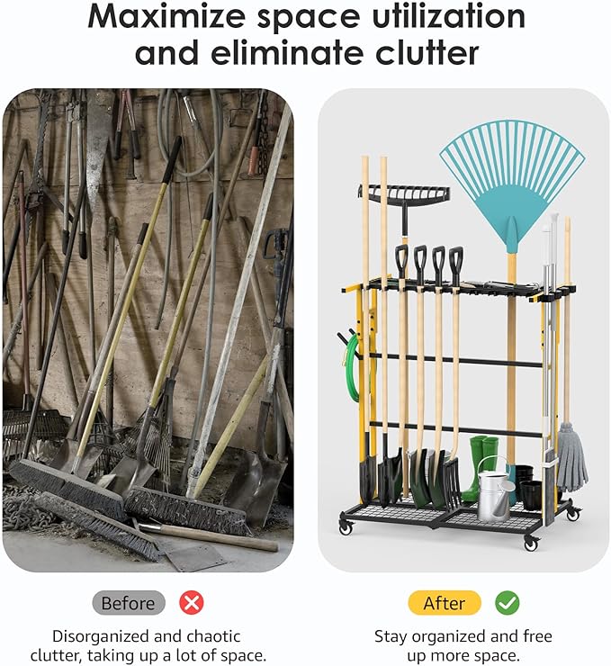 CCCEI Garage Organization with Wheels, Outdoor Gargen Yard Shed Tools Organizer Cart, Home Storage for Cleaning Supplies Organizer, Broom Holder, for Shovel and Rake, Long Farming and Farming Tools.