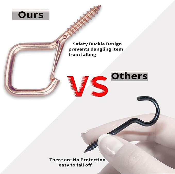 - 🔨 Safety Buckle Design: Featuring a unique safety buckle design, these screw hooks ensure that your decorations,string lights, or plants are not easily detached.