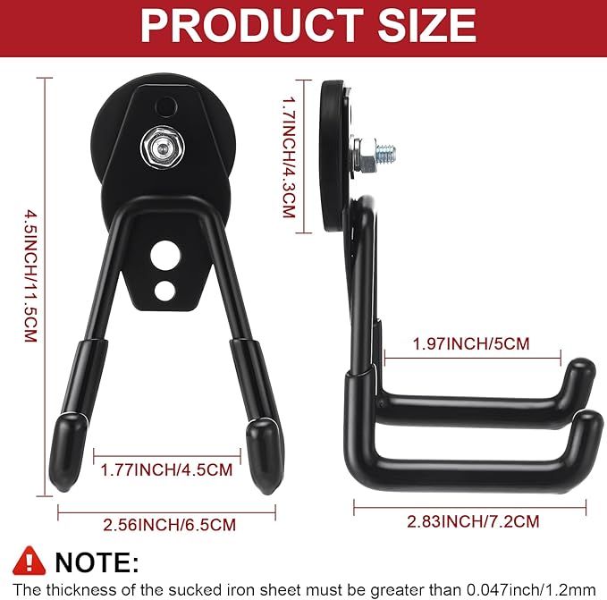 - Easy to Install: no need to use any tools, and the magnetic hooks will not break the surface; The black magnetic hooks can be placed directly on the metal surface; Please note that the thickness of the sucked iron sheet must be thicker than 0.047 inch/ 1.2 mm; Or else the magnetic hook will slide off