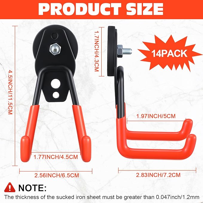 - Easy to Install: no need to use any tools, and the magnetic hooks will not break the surface; The orange magnetic hooks can be placed directly on the metal surface; Please note that the thickness of the sucked iron sheet must be thicker than 0.047 inch/ 1.2 mm; Or else the magnetic hook will slide off
