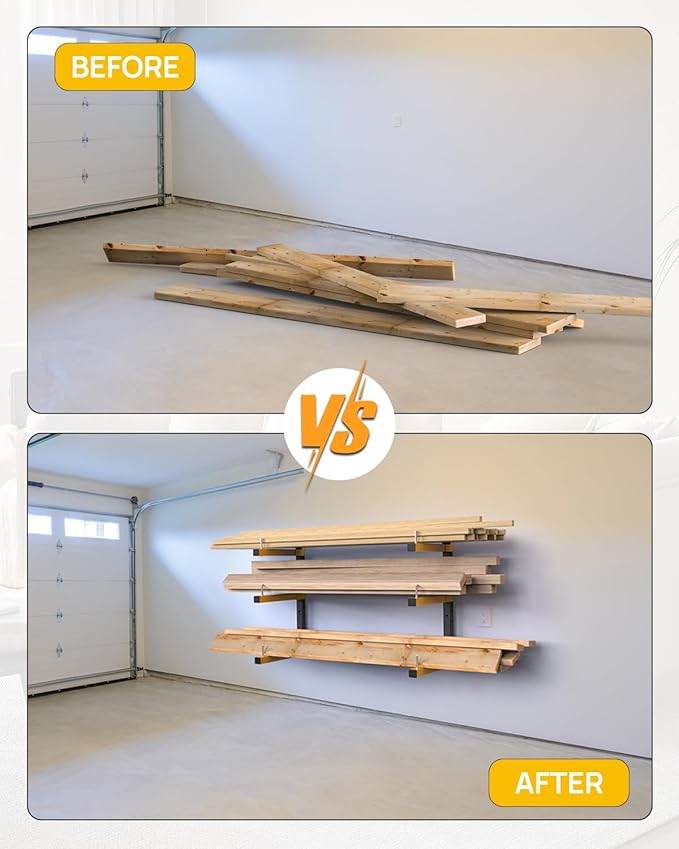- LUMBER STORAGE RACK WALL MOUNT: Wood storage rack is suitable for various walls, such as concrete wall, wood panel wall, red brick wall, etc. The yellow arm is 16 inches long, and the middle bracket moves up and down 4 inches according to the storage size. The Lumber rack storage space size is (7 inches) and (11 inches) The recommended installation distance between the rails is 3.8 to 6 feet, which can be adjusted according to your needs