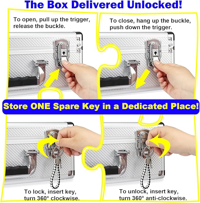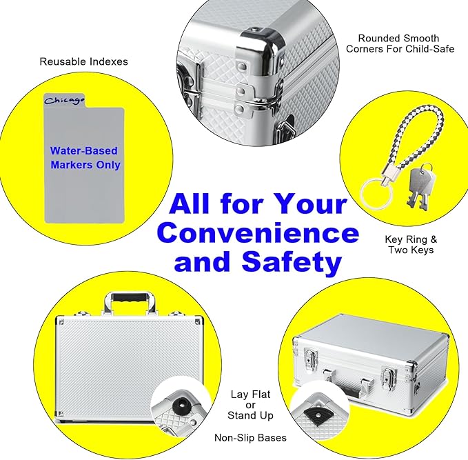 - **Thoughtful, User-Centric Features** - **Multi-Position Use:** Lay flat for easy access or stand it upright with non-slip base guards. - **Child-Safe Design:** Rounded, smooth corners protect against accidental bumps or scratches. - **Reusable Indexes:**PP writable/erasable index cards for quick labeling . - **Key Security:** Includes a key ring + spare key to prevent lockouts.