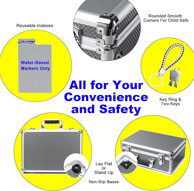 - **Thoughtful, User-Centric Features** - **Multi-Position Use:** Lay flat for easy access or stand it upright with non-slip base guards. - **Child-Safe Design:** Rounded, smooth corners protect against accidental bumps or scratches. - **Reusable Indexes:**PP writable/erasable index cards for quick labeling . - **Key Security:** Includes a key ring + spare key to prevent lockouts.
