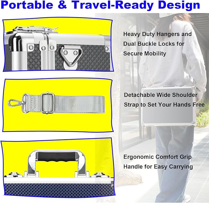 - **Portable & Travel-Ready Design** The ergonomic comfort grip handle ensure easy carrying,and the detachable, shoulder strap (color-matched for style) set your hands free. Dual reinforced buckle locks and shock-absorbent egg-crate foam secure cards during transit, this card storage box makes sharing and trading with more confidence.